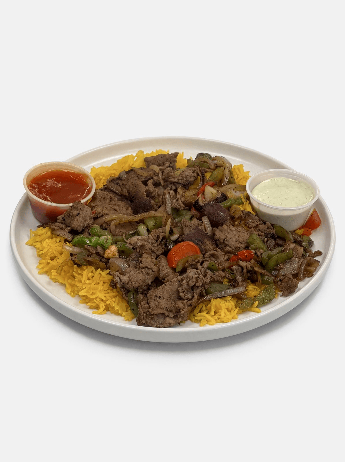 Seasoned gyro meat with grilled onions and tomatoes served over rice, with tzatziki sauce and hot sauce on the side.