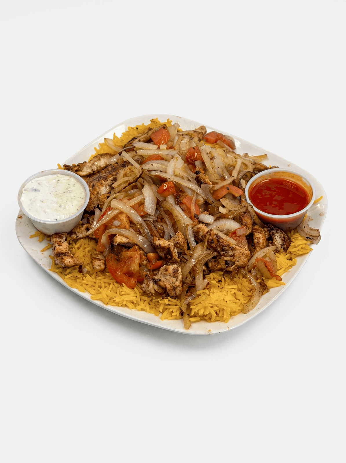 Grilled chicken with sautéed onions and tomatoes served over rice, with tzatziki sauce and hot sauce on the side.