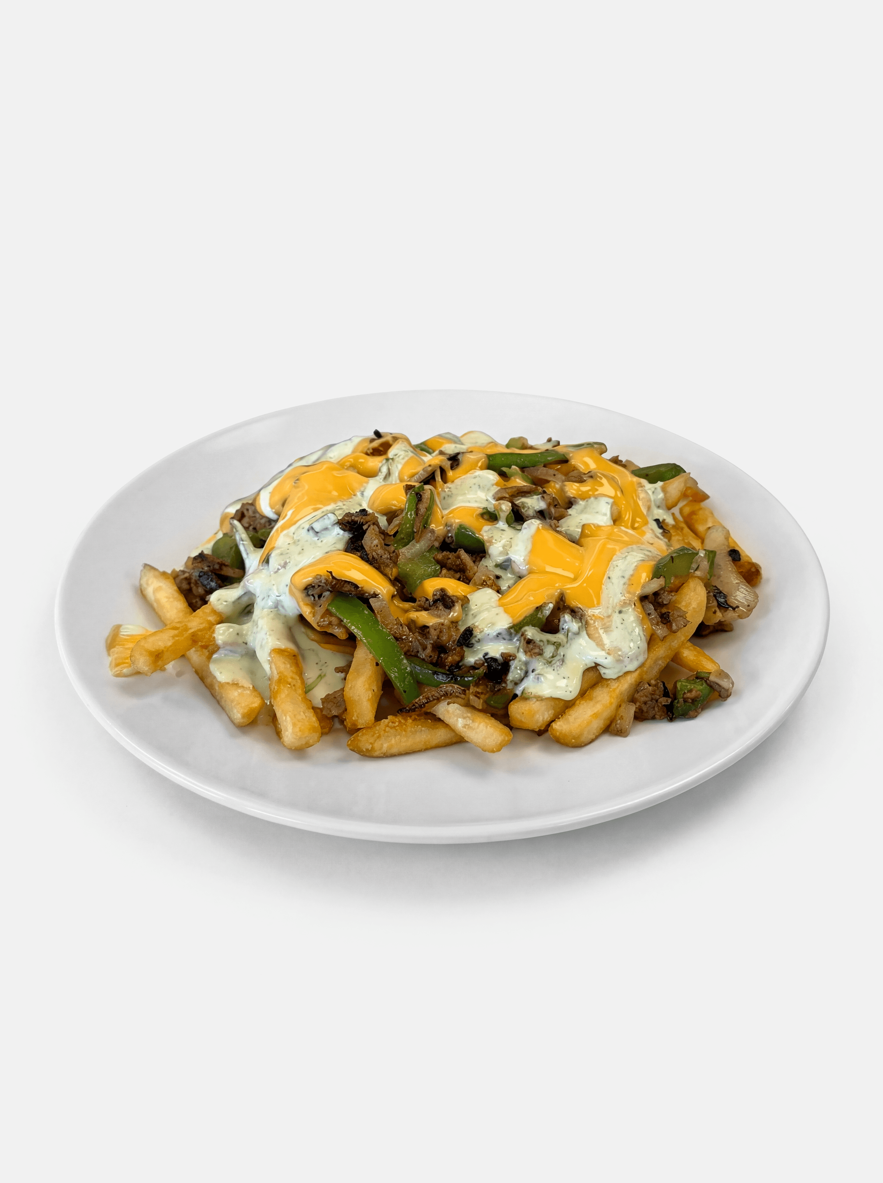 Thin slices of steak mixed with grilled onions peppers topped with cheese sauce and GG sauce