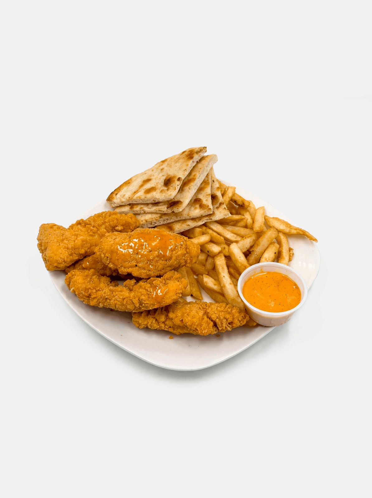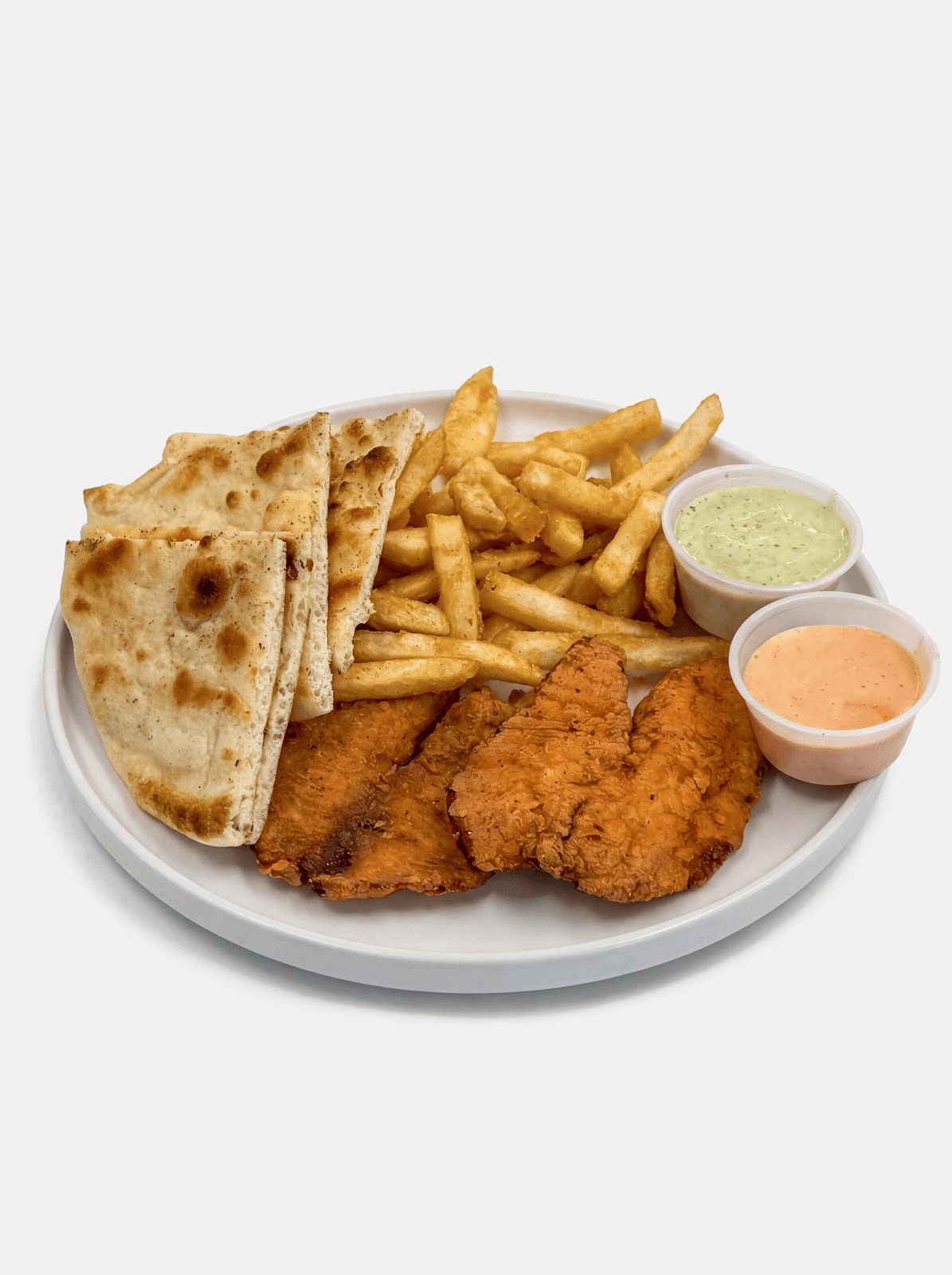 Crispy golden chicken strips served with seasoned fries, warm pita bread, and King sauce on the side.
