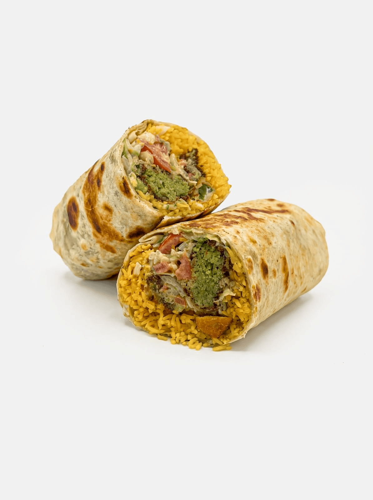 Crispy falafel with lettuce, onions, tomatoes, and creamy tahini sauce wrapped in a warm tortilla.
