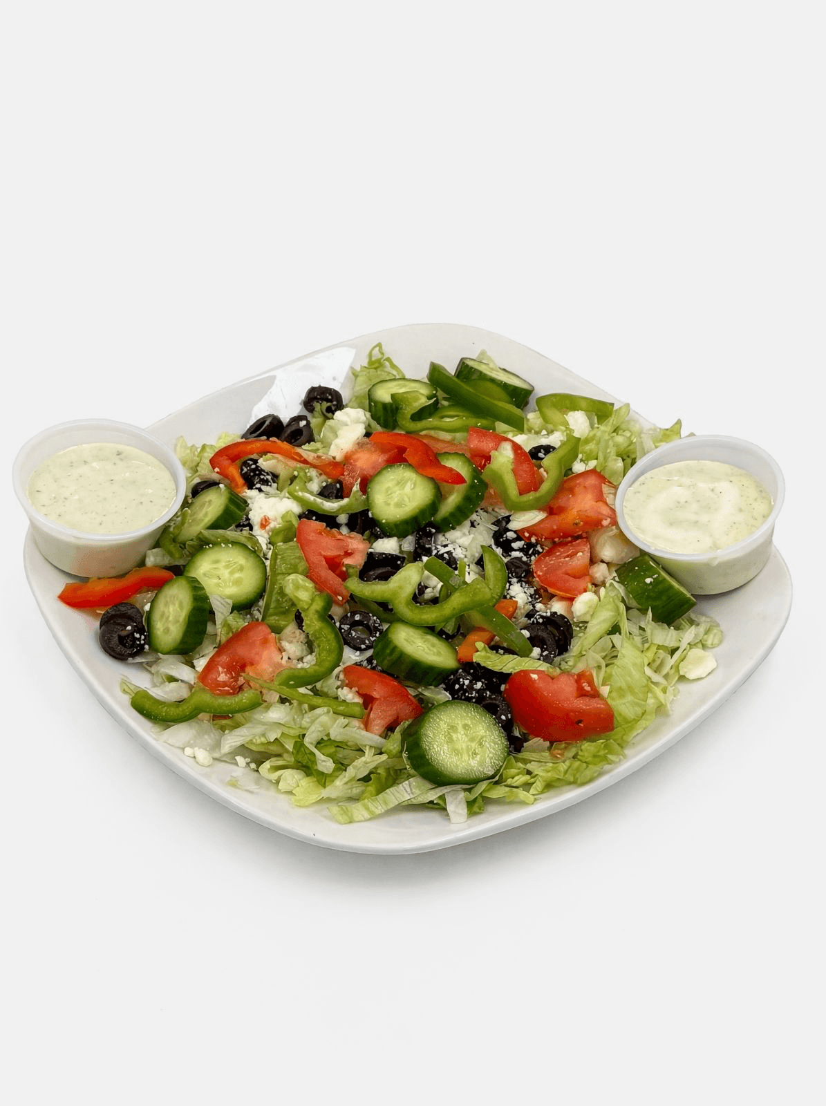 Fresh chopped lettuce, cucumbers, tomatoes, green peppers, and black olives topped with feta cheese, served with creamy Greek dressing on the side.